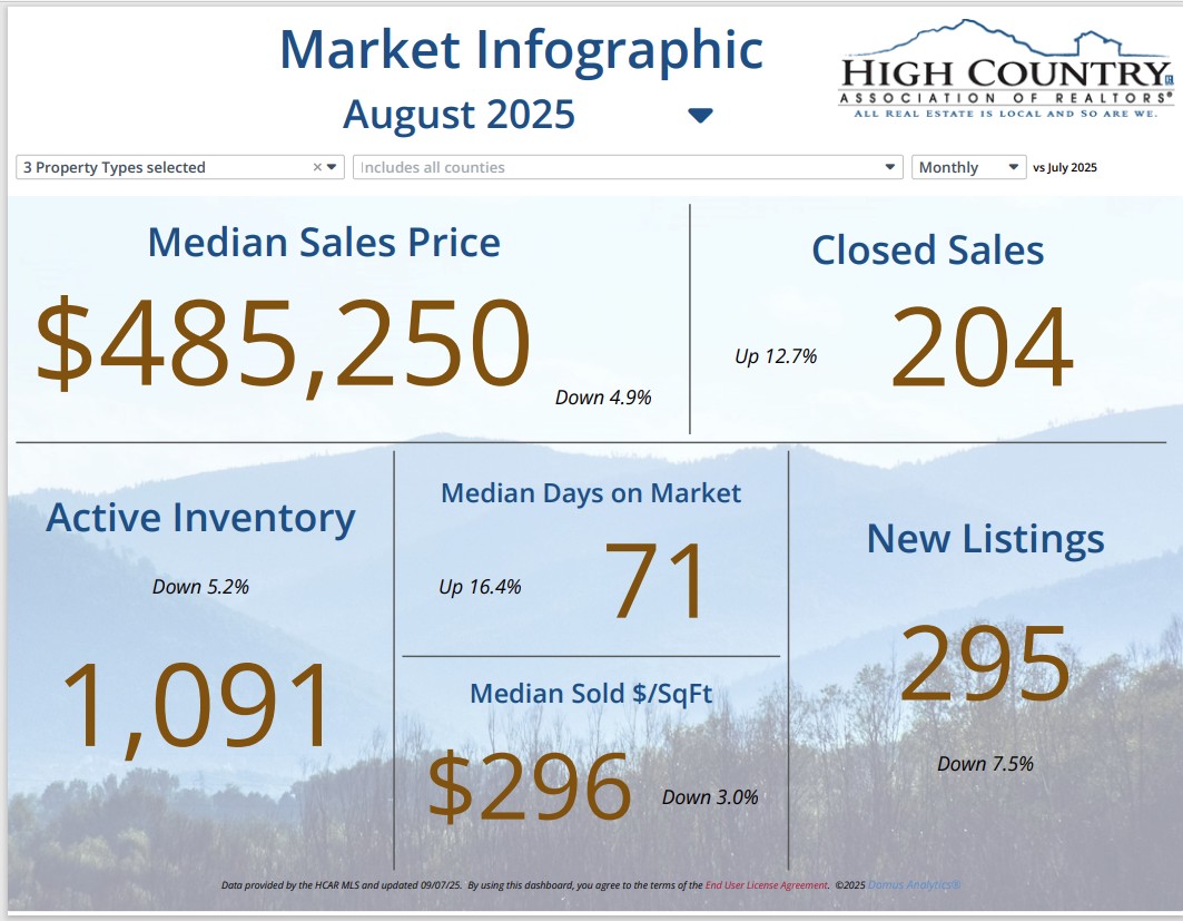 INVENTORY: Alleghany, Ashe, Avery, and Watauga Counties had 1,091 active single-family and condo/ townhouse listings during August 2025, with an additional 295 new listings during the month.
