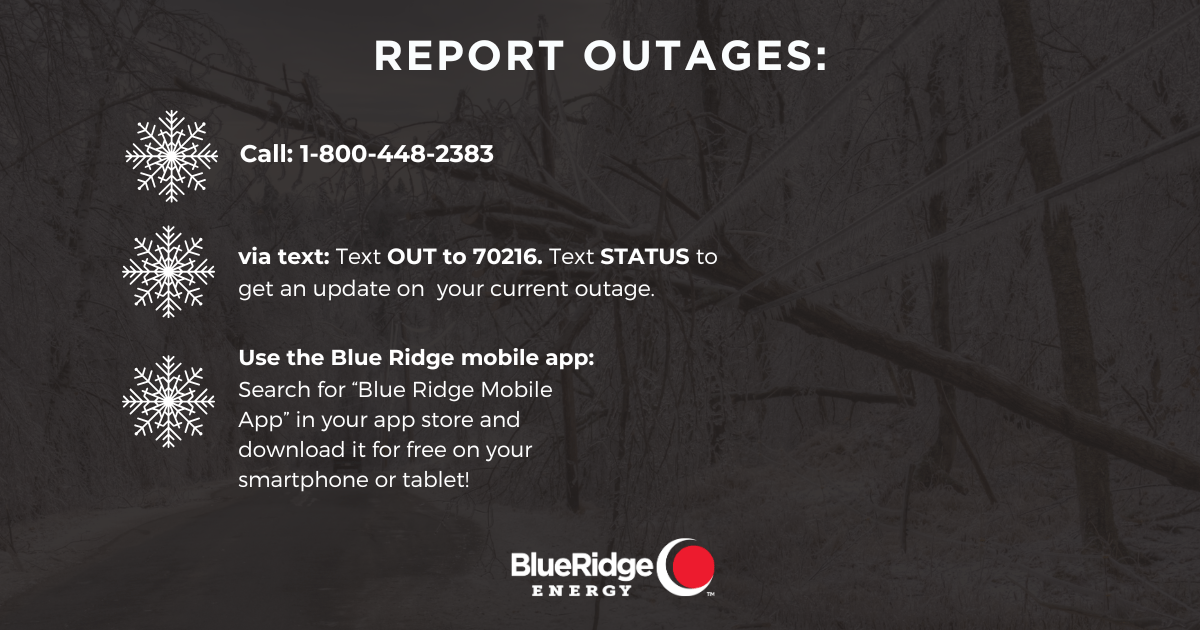 In the event of major outages, Blue Ridge Energy shares restoration updates on its social media at www.facebook.com/blueridgeenergy, www.instagram.com/blueridgeenergy, and www.twitter.com/blueridgeemc. Note: Outages cannot be reported over social media; they must be submitted through the official reporting channels listed above to be entered in the cooperative’s outage management system.