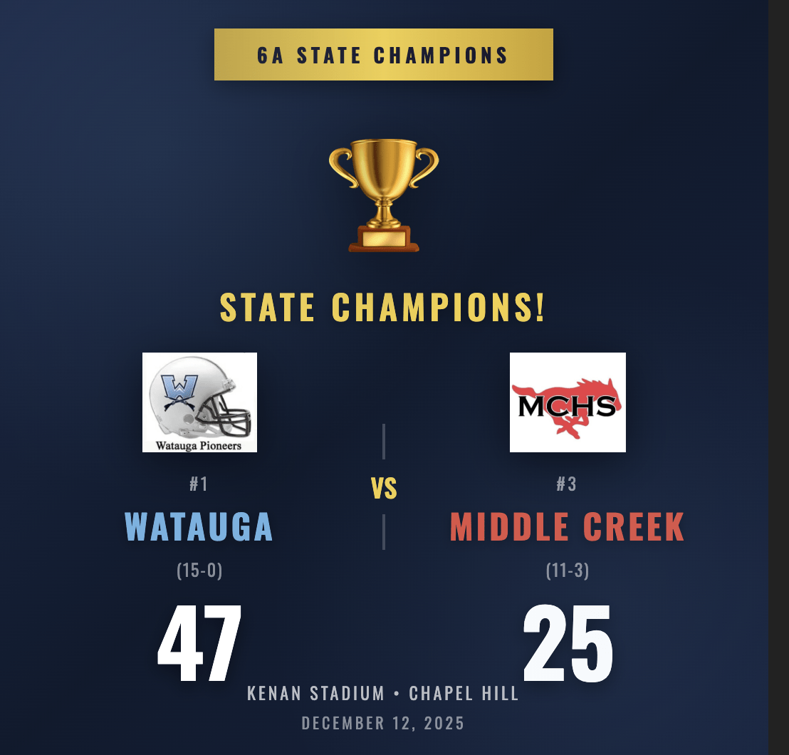Forty-seven years after their last state championship, the Pioneers scored 47 points to defeat Middle Creek 47-25 in the NCHSAA 6A State Championship at Kenan Stadium on Friday — just one week after winning their semifinal with 47 seconds remaining.