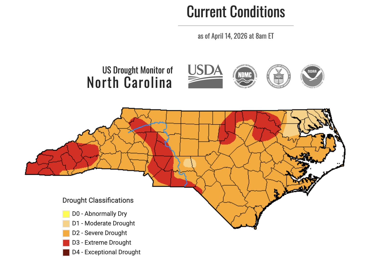 Seven counties moved to D3 this week, including Wake County — home to Raleigh — along with Durham, Granville, Henderson, Scotland, Transylvania, and Vance. The expansion means Extreme Drought now stretches from the western mountains through the Triangle and Charlotte metro into the northeastern Coastal Plain.