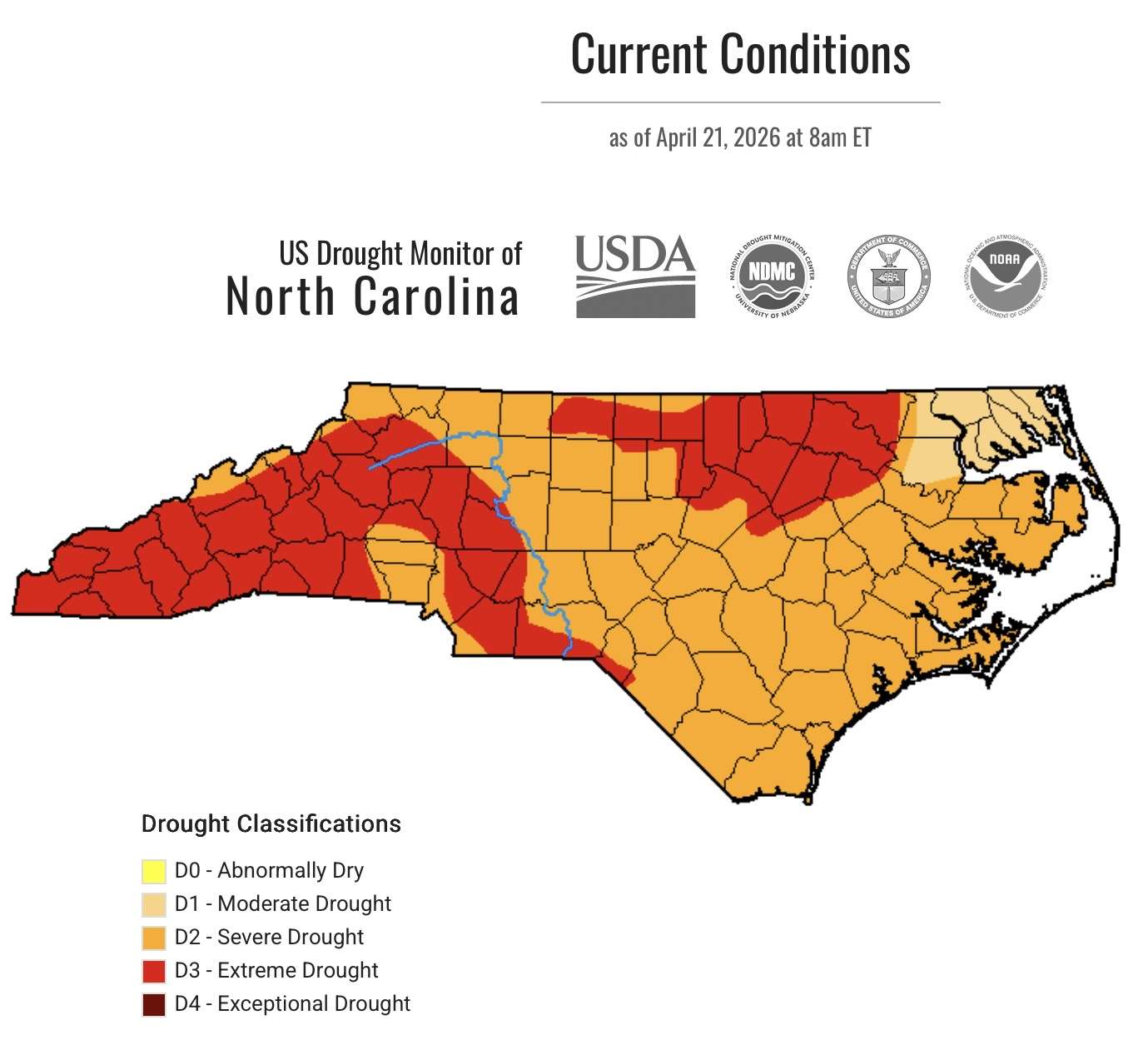 Watauga County has moved to Extreme Drought (D3) for the first time in this drought cycle. Avery and Caldwell counties also jumped to D3 this week, joining Wilkes County which moved to D3 two weeks ago. Ashe and Alleghany counties remain in Severe Drought (D2).