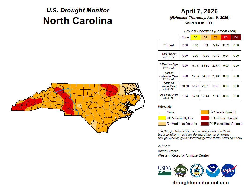 North Carolina's drought continues to intensify for the third straight week, with Extreme Drought expanding to 23 counties — up from 15 last week and just 7 two weeks ago.