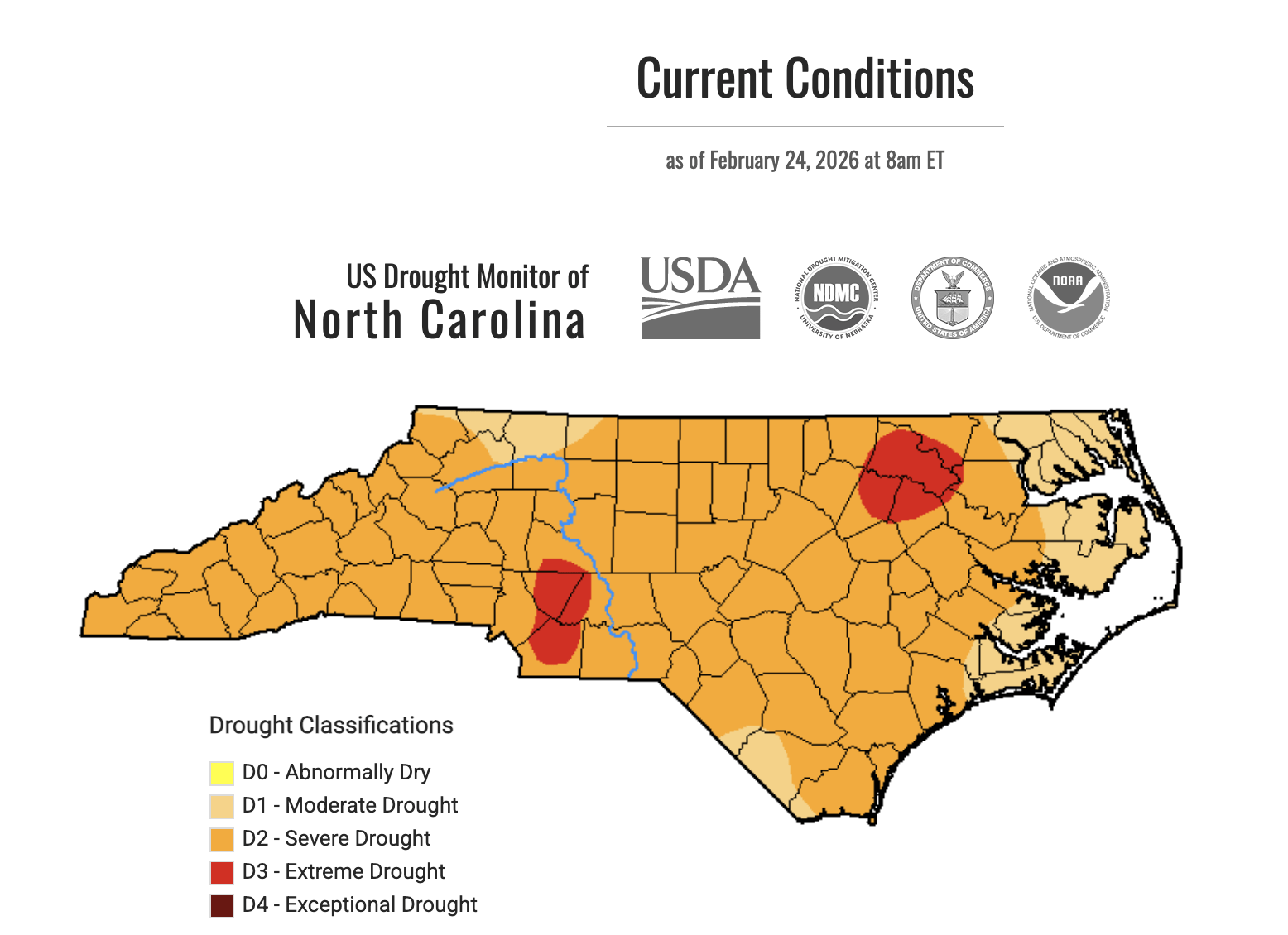 In the latest drought update for North Carolina, severe drought conditions continue to grip much of the state, with Extreme Drought now affecting seven counties and Severe Drought covering 80 counties.