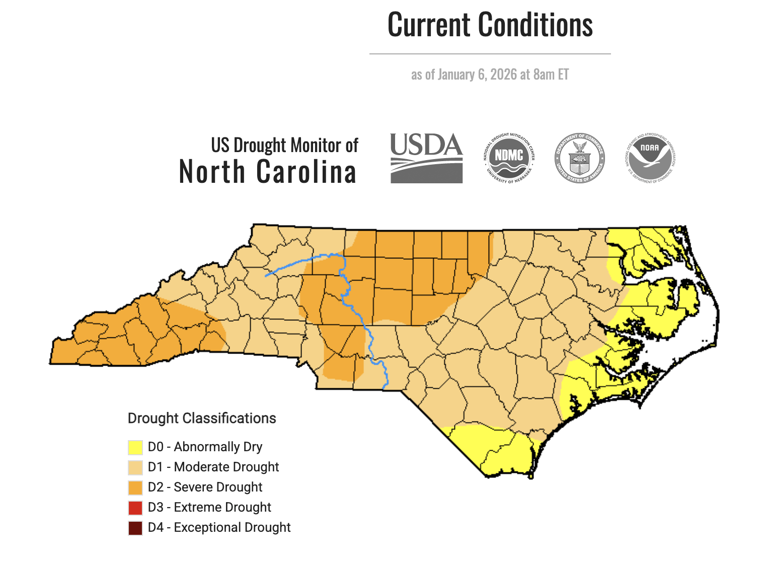 The weekly update, put out by the North Carolina Drought Management Council, shows zero counties in the Extreme Drought status, 32 counties in the Severe Drought category, 53 counties in Moderate Drought, and 15 counties in Abnormally Dry status.