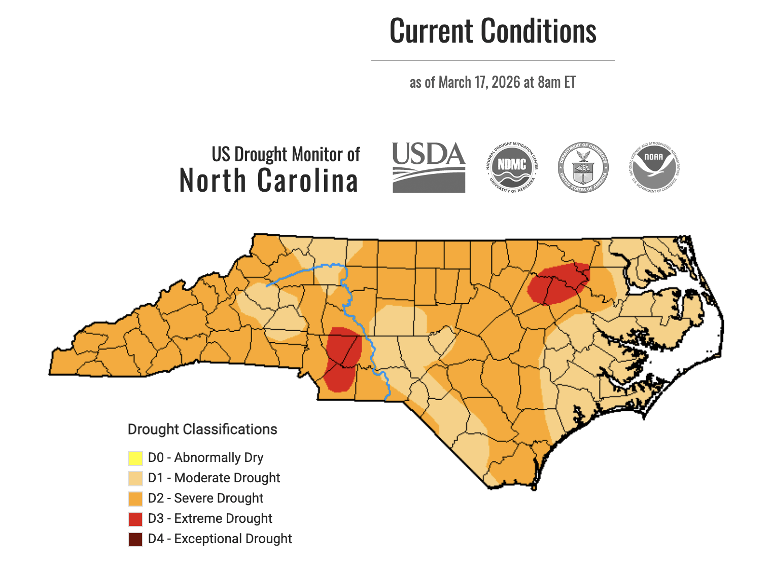 In the latest drought update for North Carolina, severe drought conditions continue across much of the state, with Extreme Drought affecting six counties and Severe Drought covering 65 counties.