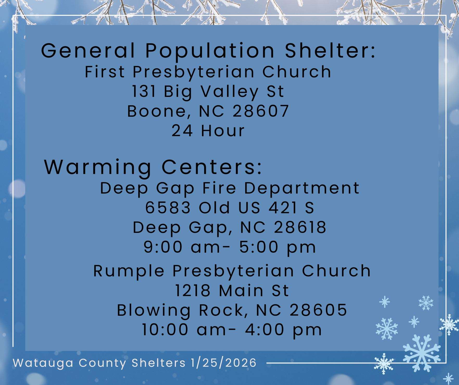 Watauga County has established multiple shelters and warming centers to assist residents during the severe winter storm.