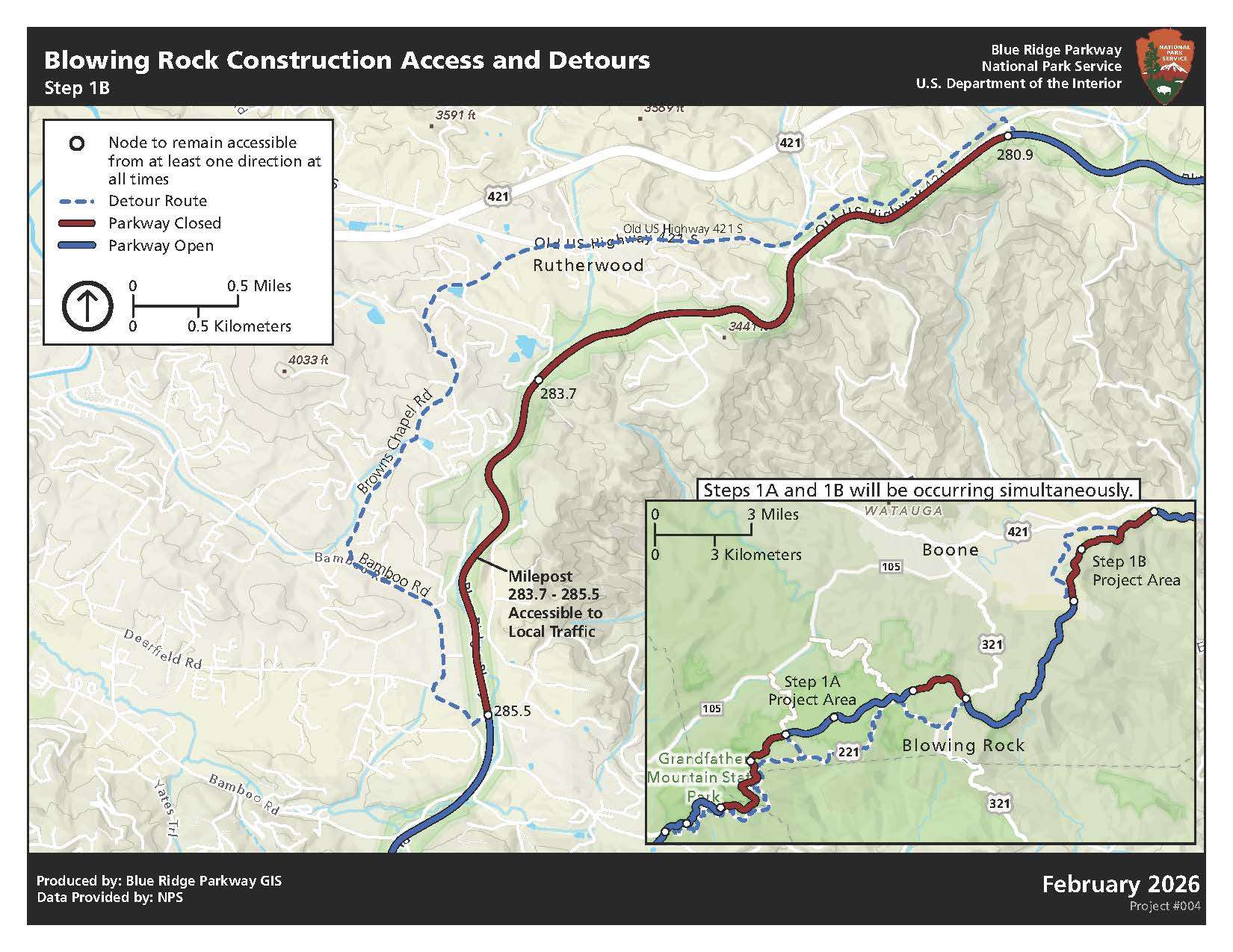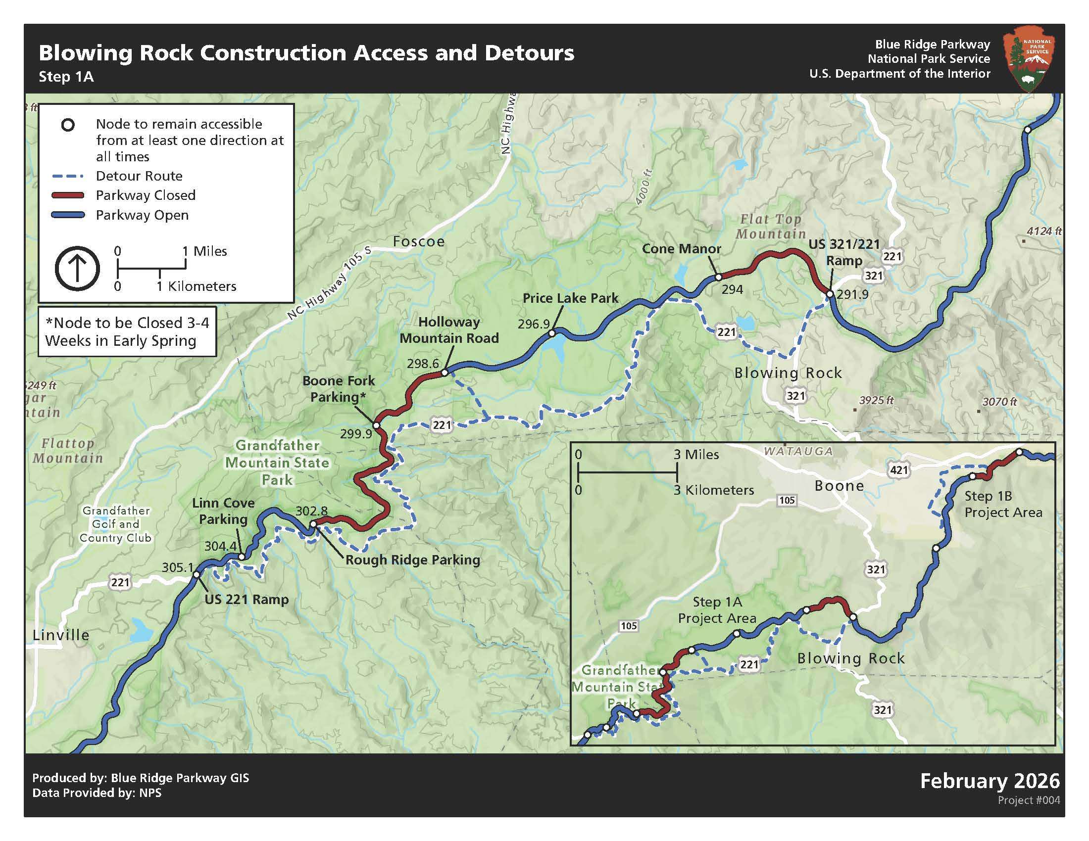 A signed detour route, along with a system of signs on secondary roads will direct visitors from the main detour route to attractions along this corridor, including Cone Memorial Park, Price Lake, popular Grandfather Mountain trailheads and Linn Cove trailhead parking. As construction progresses, closure locations will alternate. At all times, the contractor will maintain uninterrupted access from either the north or the south to these visitor facilities and recreation areas. This full road rehabilitation is expected to be complete in fall 2026.