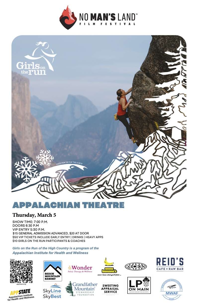 Sponsors of the No Man’s Land Film Festival and Girls on the Run of the High Country include Sweeting Appraisal Service, Beech Mountain Resort, SkyLine/SkyBest, Recess Skate and Snow, Anna Banana’s, Wonder Pelvic Therapy & Wellness, LP on Main, Grandfather Mountain Stewardship Foundation, McMillan Weidner Abernethy Foundation and Reid’s Cafe.
