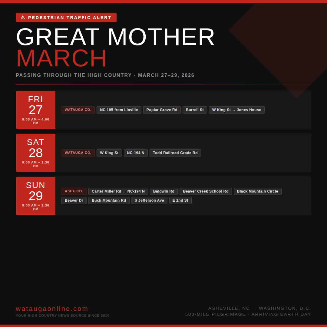 Friday, March 27 (9:00 a.m. – 4:00 p.m.): NC Highway 105 from Linville, Poplar Grove Road, Burrell Street, and West King Street to the Jones House in Boone.