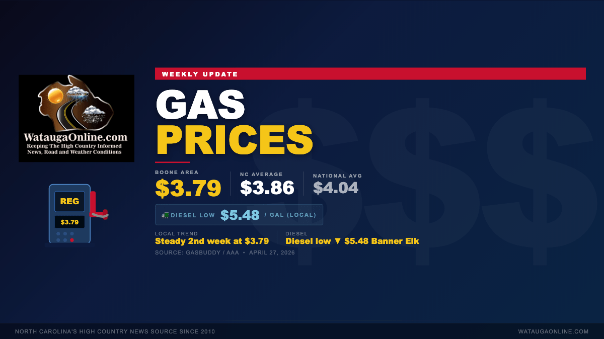 Local prices have held at $3.79 since our last report on Sunday, April 19, following a peak of $3.89 per gallon in early April at the height of the U.S.-Iran conflict. Diesel showed some continued easing, with the local low dropping to $5.48 at the Speedway in Banner Elk — down from $5.57 last week. Most Boone-area diesel stations remain at $5.79.