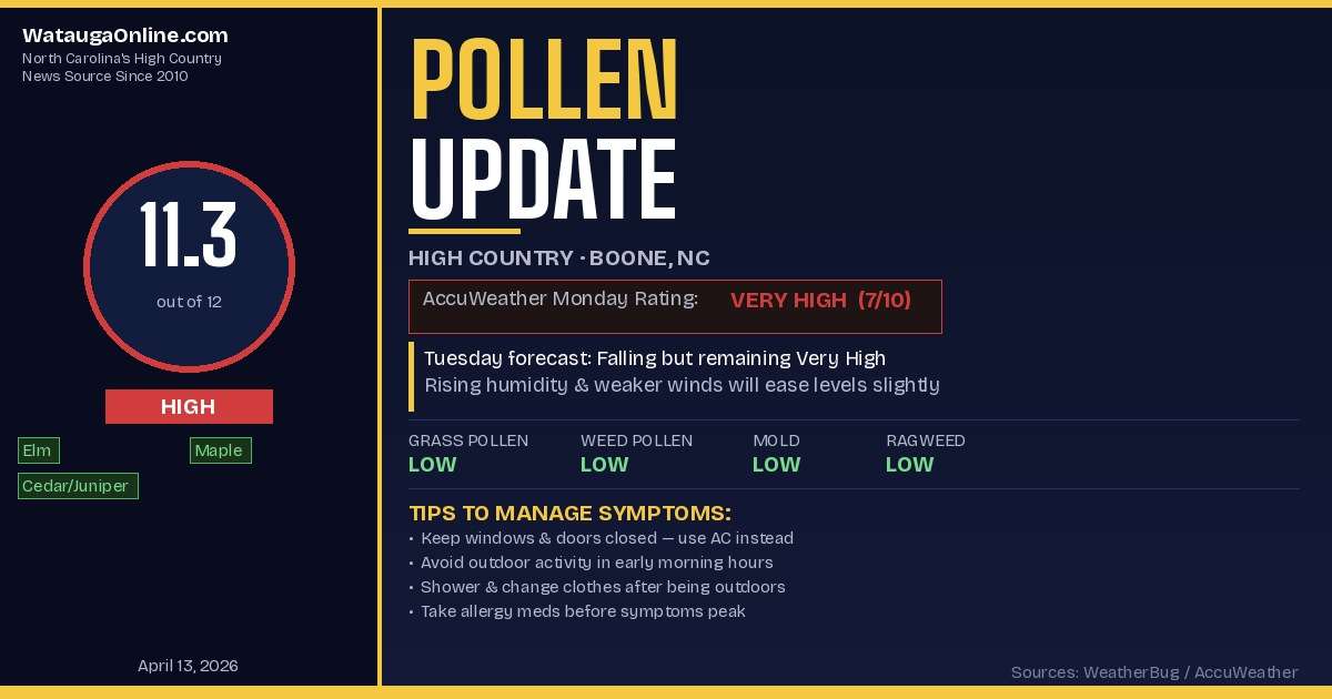 WeatherBug's Boone pollen index stands at 11.3 out of 12 — rated High — with Elm, Maple, and Cedar/Juniper as the top contributors. AccuWeather rates Monday's tree pollen as Very High (7 out of 10) for the Boone area, with westerly winds at 7 mph and gusts to 18 mph continuing to carry pollen through the region.