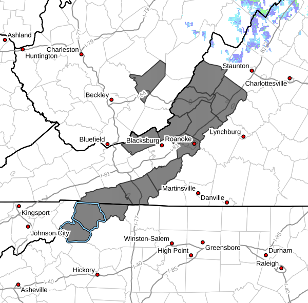 Affected Areas in Virginia: Giles, Grayson, Carroll, Floyd, Craig, Alleghany, Bath, Roanoke, Botetourt, and Rockbridge counties. Cities affected include Floyd, Fincastle, Galax, New Castle, Troutdale, Pearisburg, Salem, Hot Springs, Buena Vista, Volney, Covington, Clifton Forge, Whitetop, Lexington, Duo, and Roanoke.