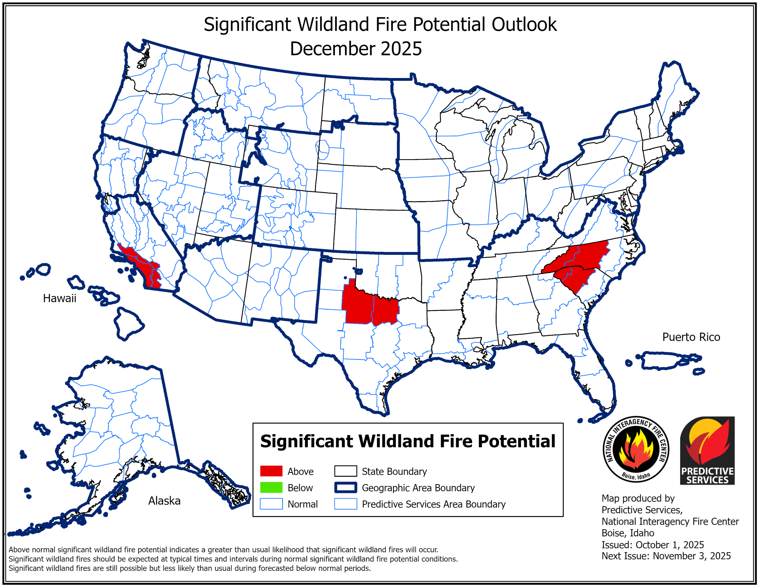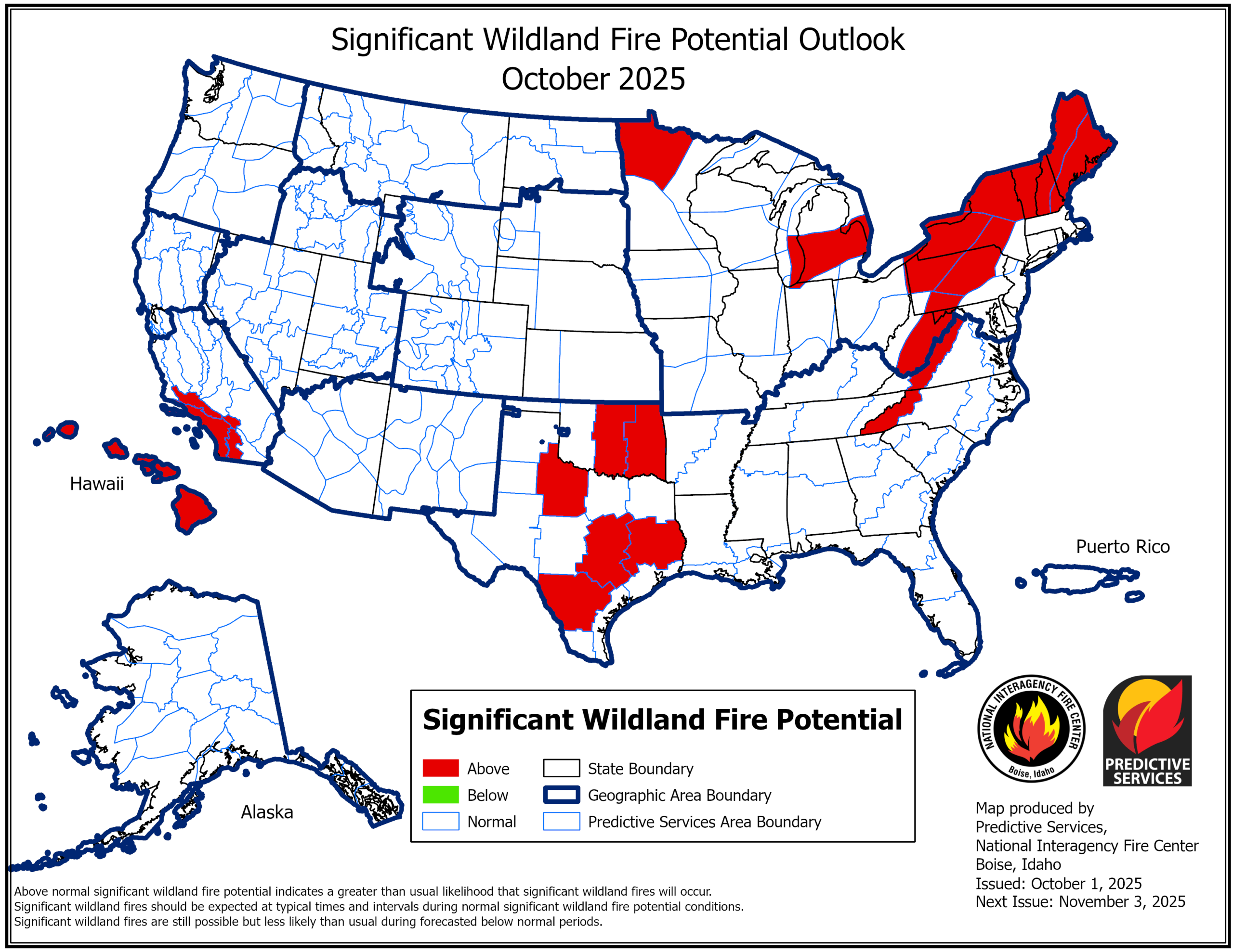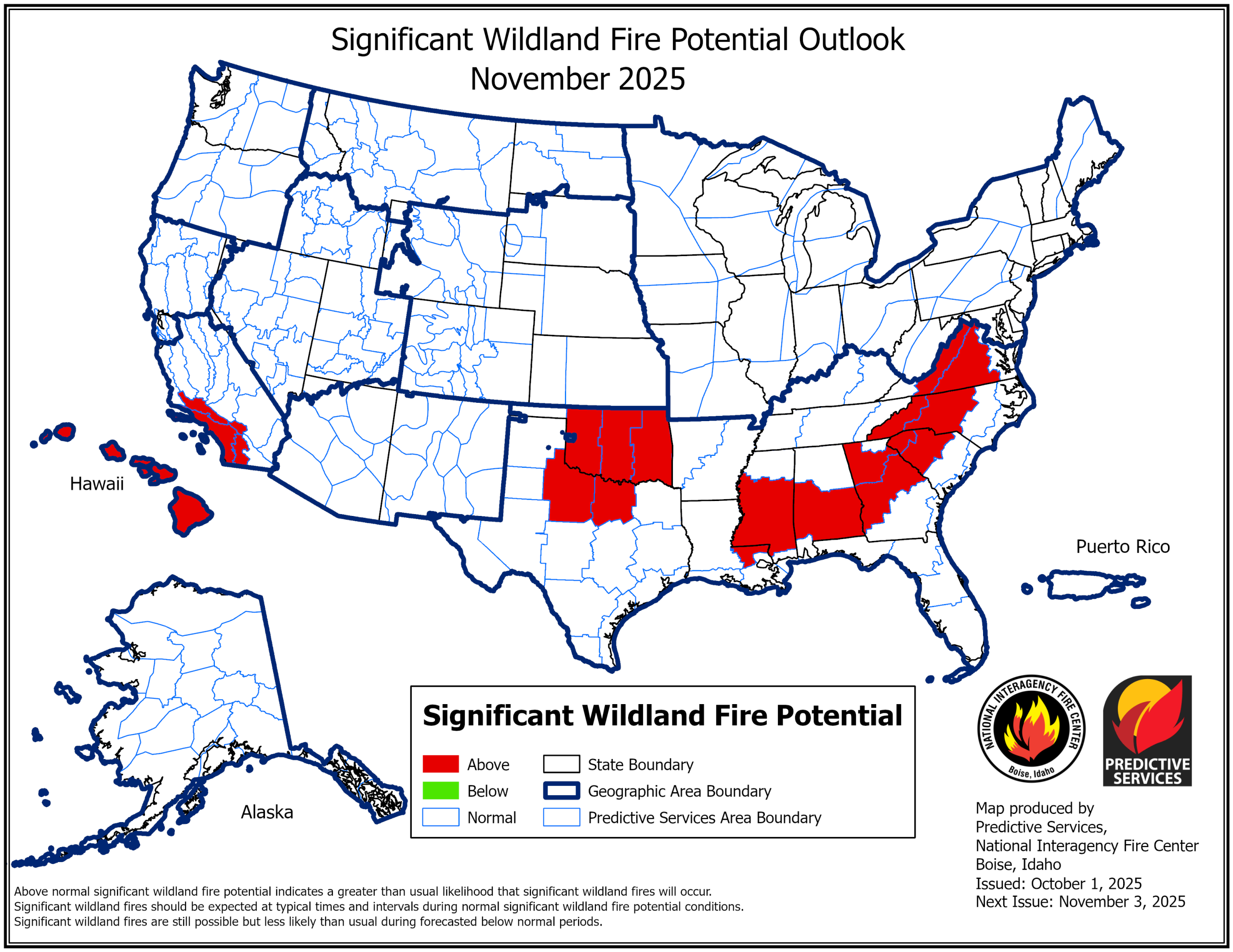 The National Interagency Fire Center outlook for the Southern Area of the United States released October 1, 2025: