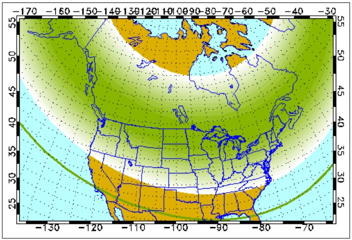 The image below from NOAA shows the potential reach of naked eye aurora (in green) and photographic (the green line towards the bottom) from a G4 storm.