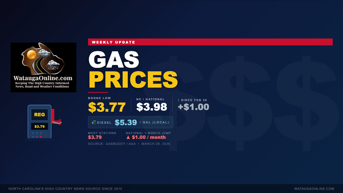 WataugaOnline publishes a weekly gas prices report. Prices are sourced from GasBuddy and AAA and may vary by location and change after posting.