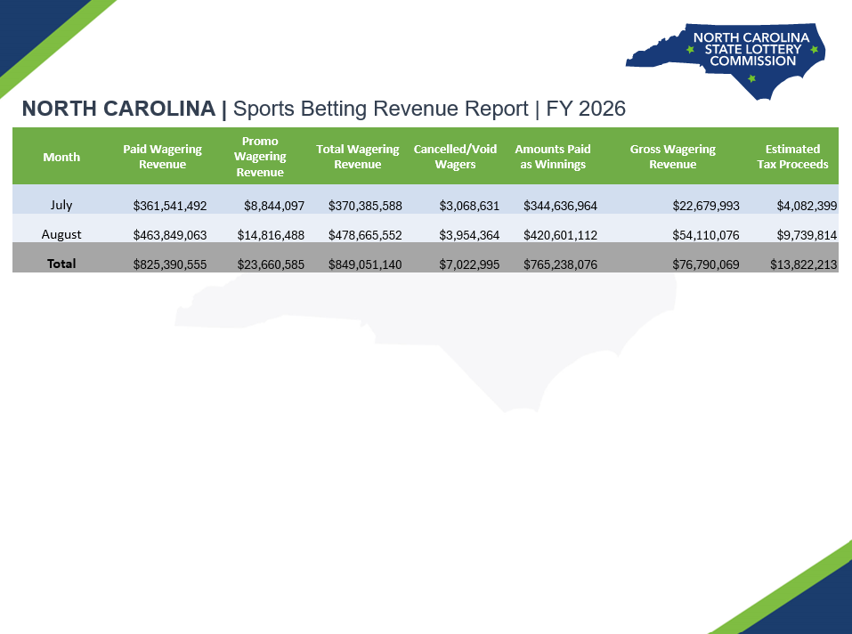 RALEIGH – The North Carolina State Lottery Commission is releasing its sports wagering revenue report for August 2025. It compiles the revenue in the month as submitted by the eight licensed interactive sports betting operators.