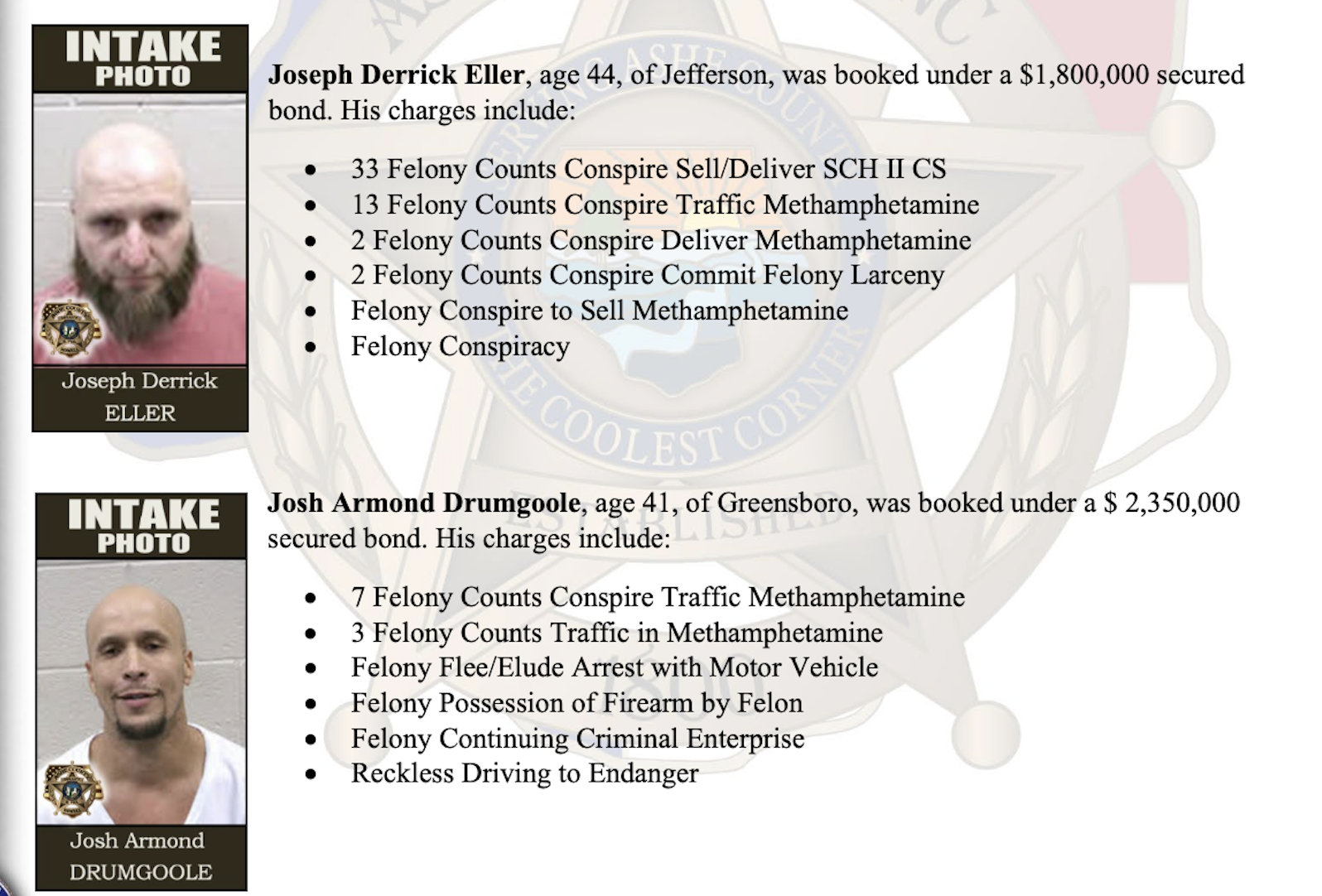 The investigation began with Joseph Derrick Eller, 44, of Jefferson. Eller was arrested multiple times during the investigation, with the first arrest occurring on Aug. 15, 2025. He was arrested again on Nov. 19, 2025, and remains in the Ashe County Detention Center on a $1.8 million bond.