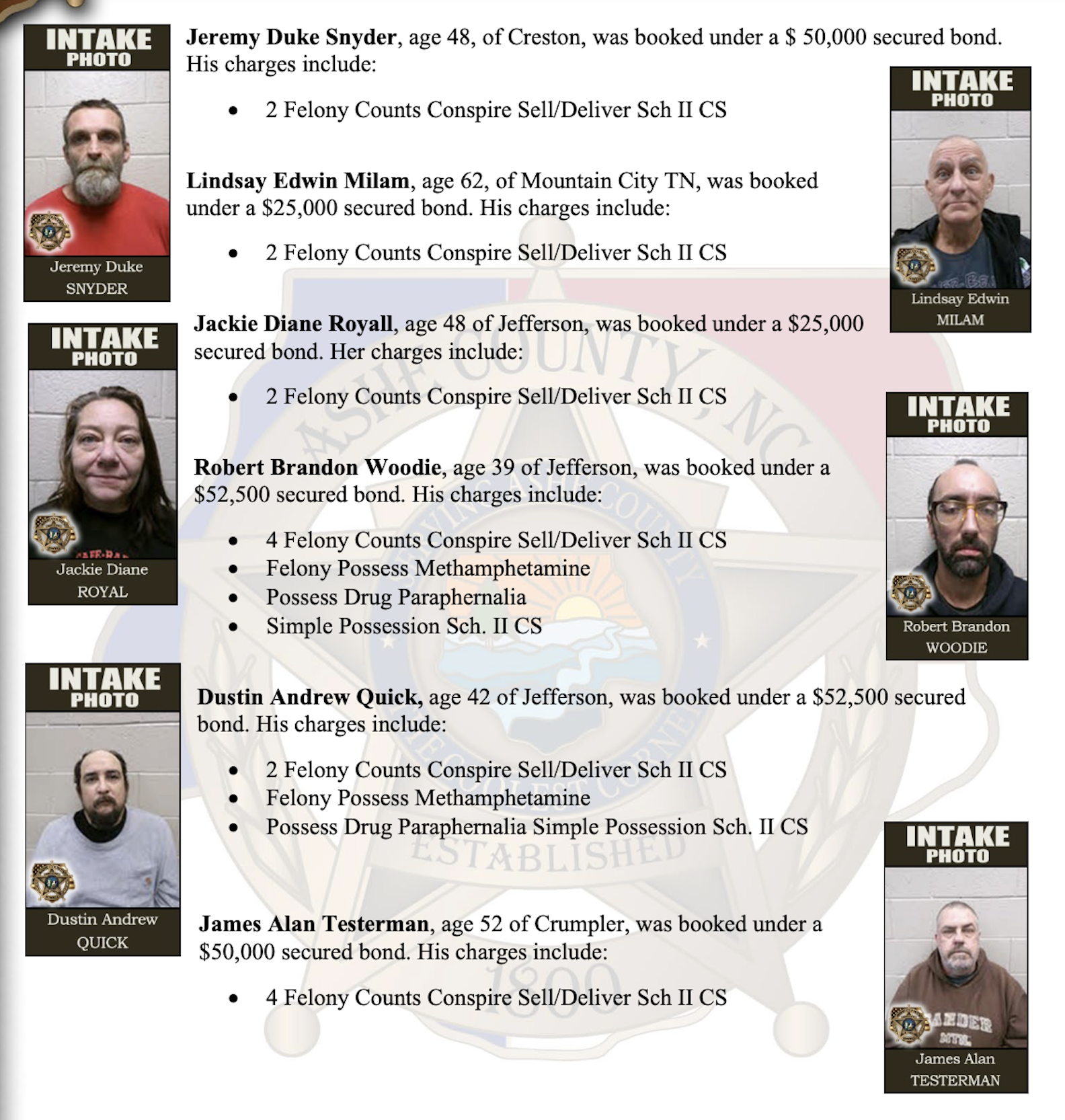 ASHE COUNTY — Ashe County Sheriff B. Phil Howell has announced the most significant drug trafficking takedown in Ashe County history is currently underway, with approximately 42 arrests – mug shots can be found below – made so far and an estimated 80 to 100 total arrests expected as the investigation continues.