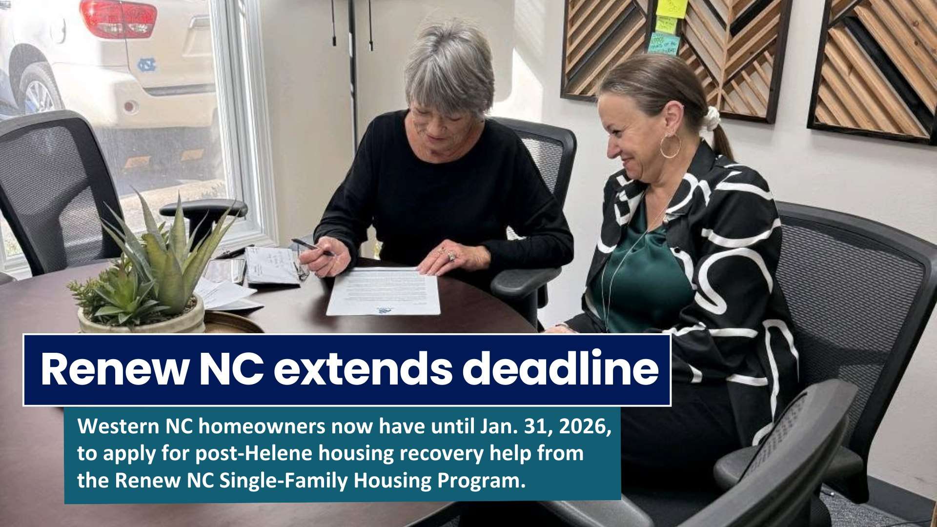 RALEIGH – Renew NC, North Carolina's housing recovery program, announced that the deadline for western North Carolina homeowners to apply for assistance through the Single-Family Housing Program has been extended to January 31, 2025. The extension provides one additional month for homeowners to submit applications for help with repairing, reconstructing, or replacing homes damaged by Hurricane Helene.