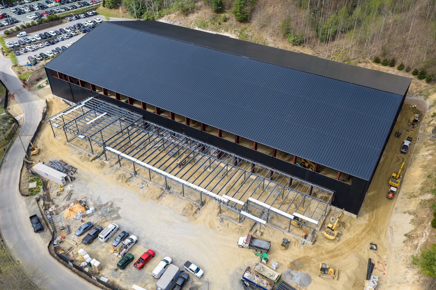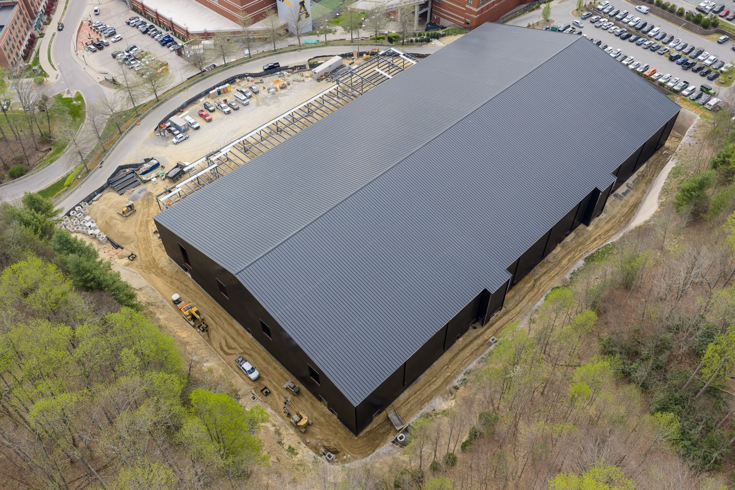 Construction is moving ahead on App State's new Sofield Family Indoor Practice Facility in Boone, with the roof now installed on the main structure and the indoor turf field on track to be ready in August.