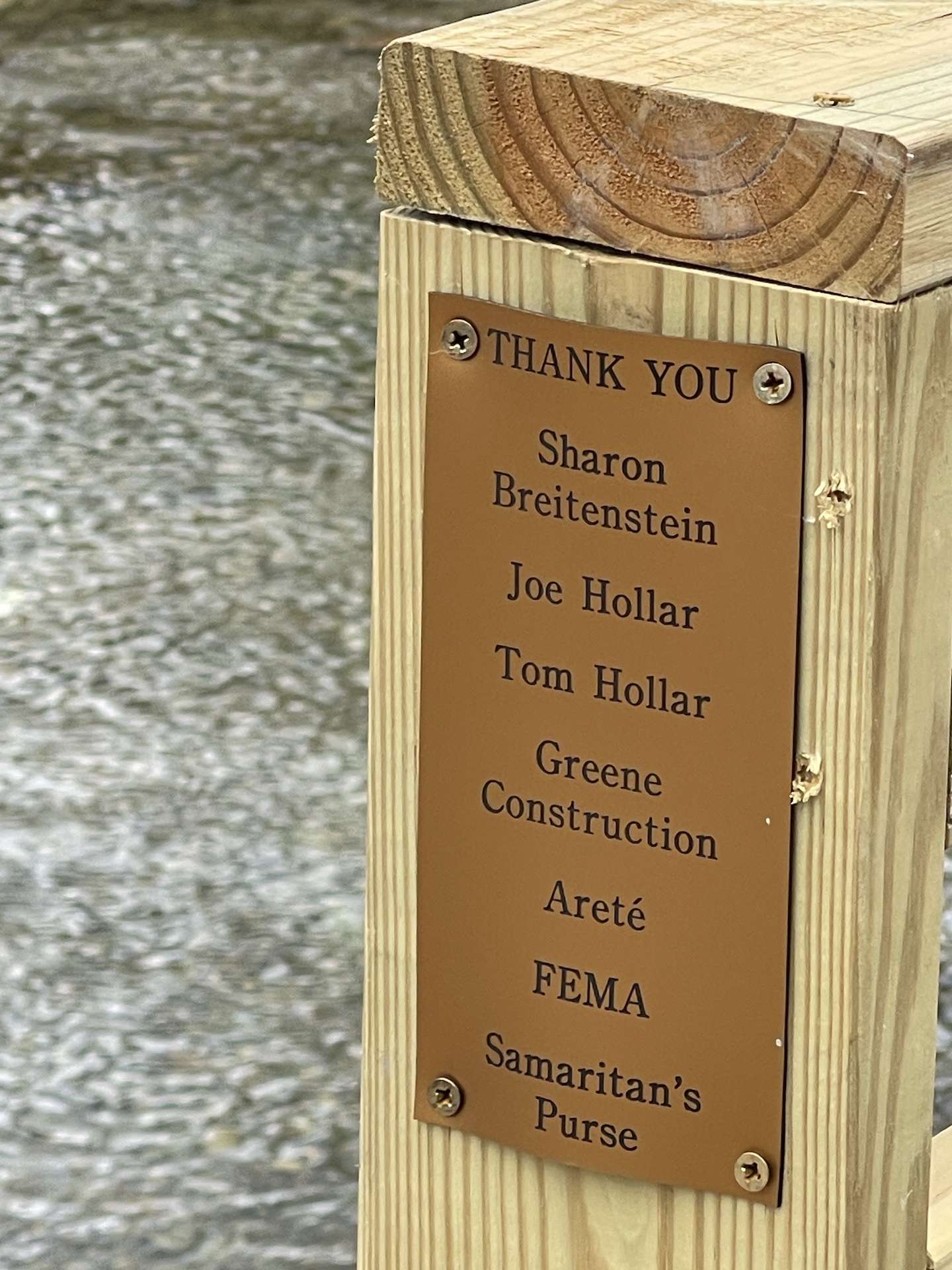 A thank-you plaque on the bridge lists Sharon Breitenstein, Joe Hollar, Tom Hollar, Greene Construction, Areté, FEMA, and Samaritan's Purse among those credited with making the project possible.