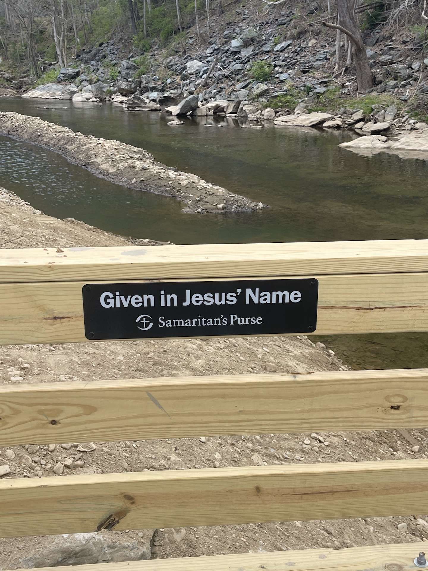 The new bridge was built with support from Samaritan's Purse, the international Christian relief organization based in Boone. Edward Graham, grandson of the late Rev. Billy Graham, serves as chief operating officer and oversees the organization's international and domestic operations. A plaque on the bridge's railing reads “Given in Jesus' Name — Samaritan's Purse.”
