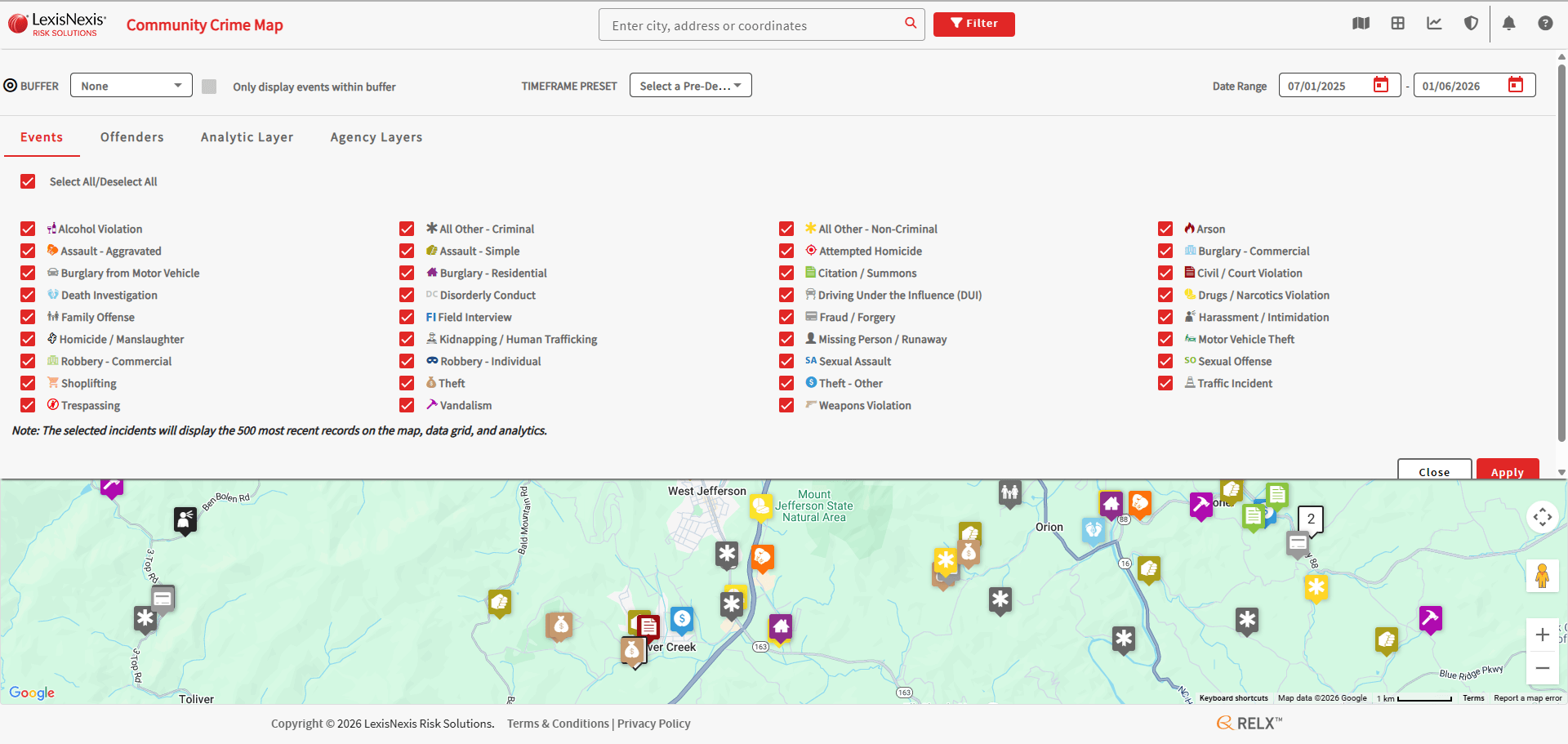 Please note, the Sheriff's Crime Map is NOT EVERY CALL we receive; these are the types of calls that the incident has been deemed criminal in nature, a report has been taken, and we have deemed it an actual investigation or arrest. We get over 70,000 “Calls-For-Service” per year; you will only see the major ones.