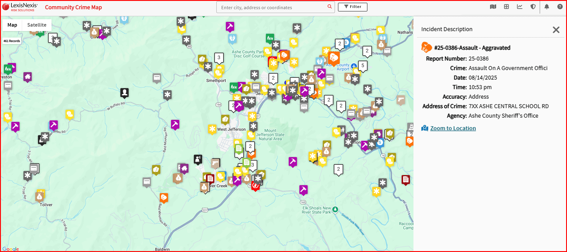 The Community Crime Map is part of the Ashe County Sheriff's Office's ongoing efforts to use technology and innovation to enhance service, increase awareness, and support the shared goal of a safer Ashe County for everyone.