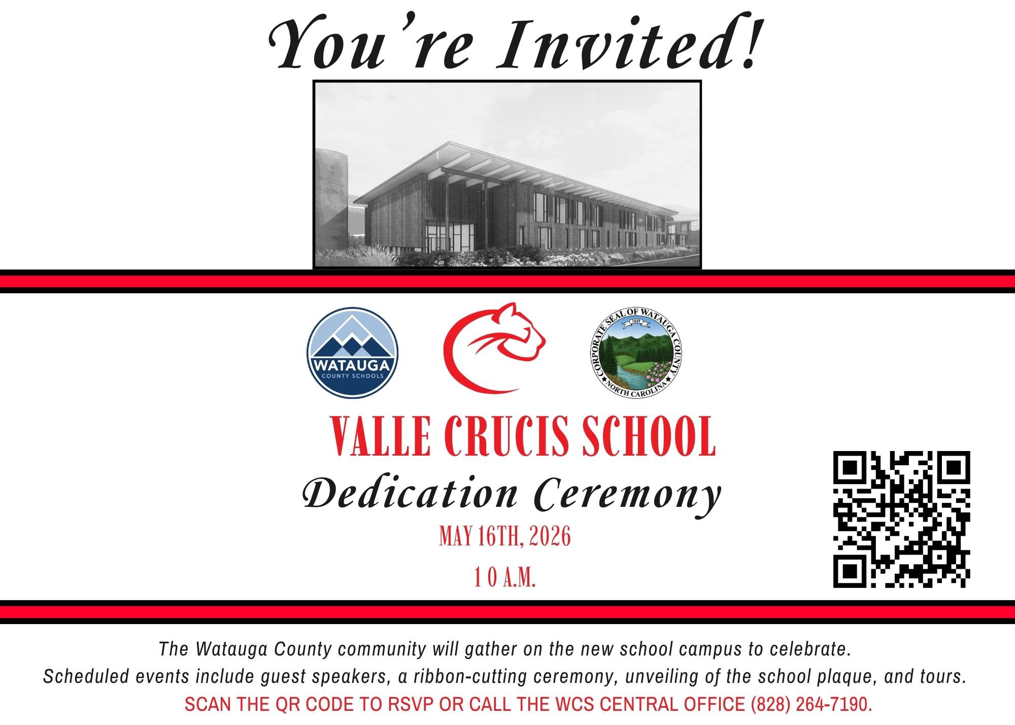 WATAUGA — Watauga County Schools and the Watauga County Commissioners are pleased to announce a formal dedication ceremony for the new Valle Crucis campus on Saturday, May 16, 2026.