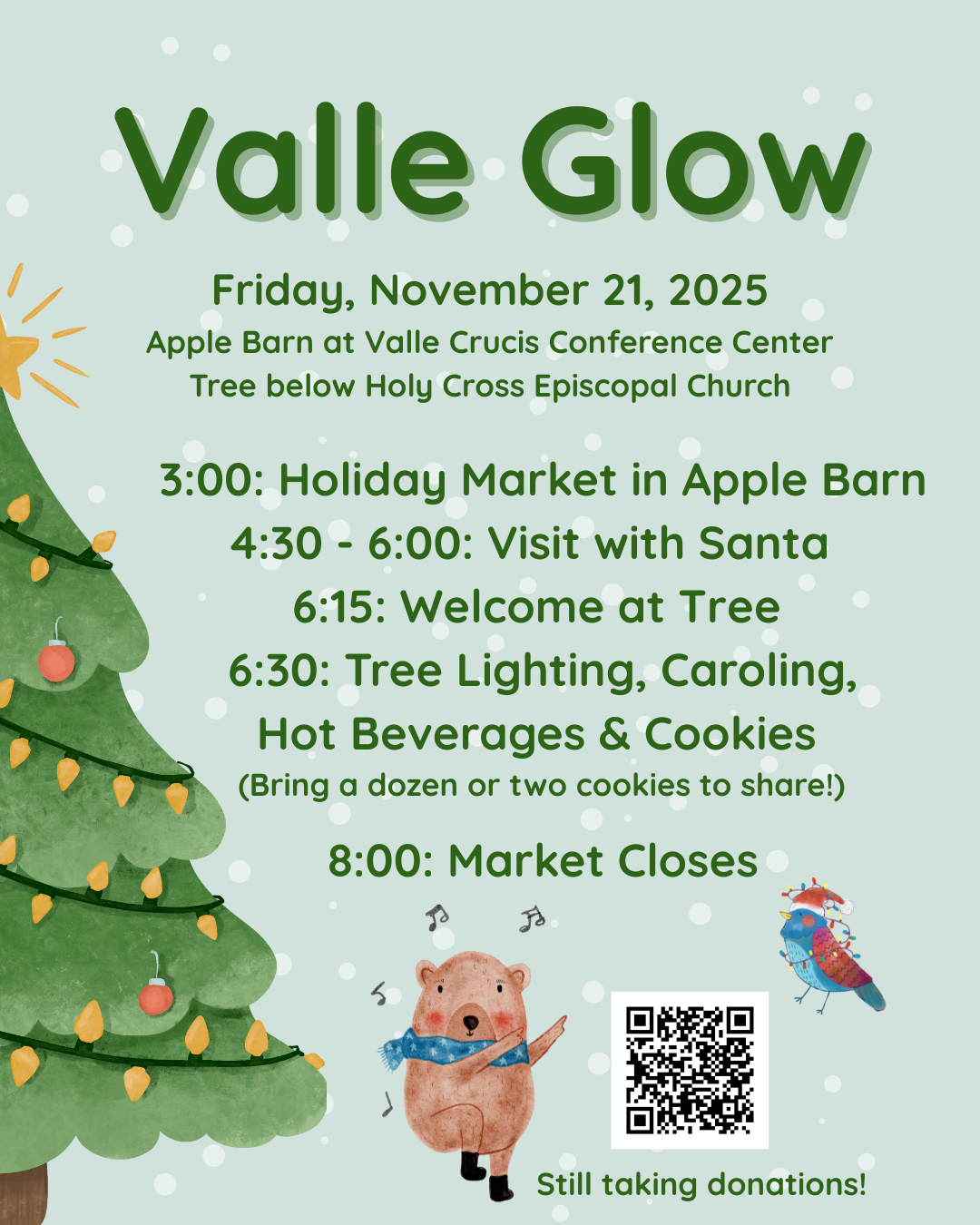 The entire Valle Crucis community and our friends throughout the High Country are warmly invited to gather, celebrate, and glow with us. Media outlets are encouraged to cover our story of resilience, generosity, and holiday spirit.