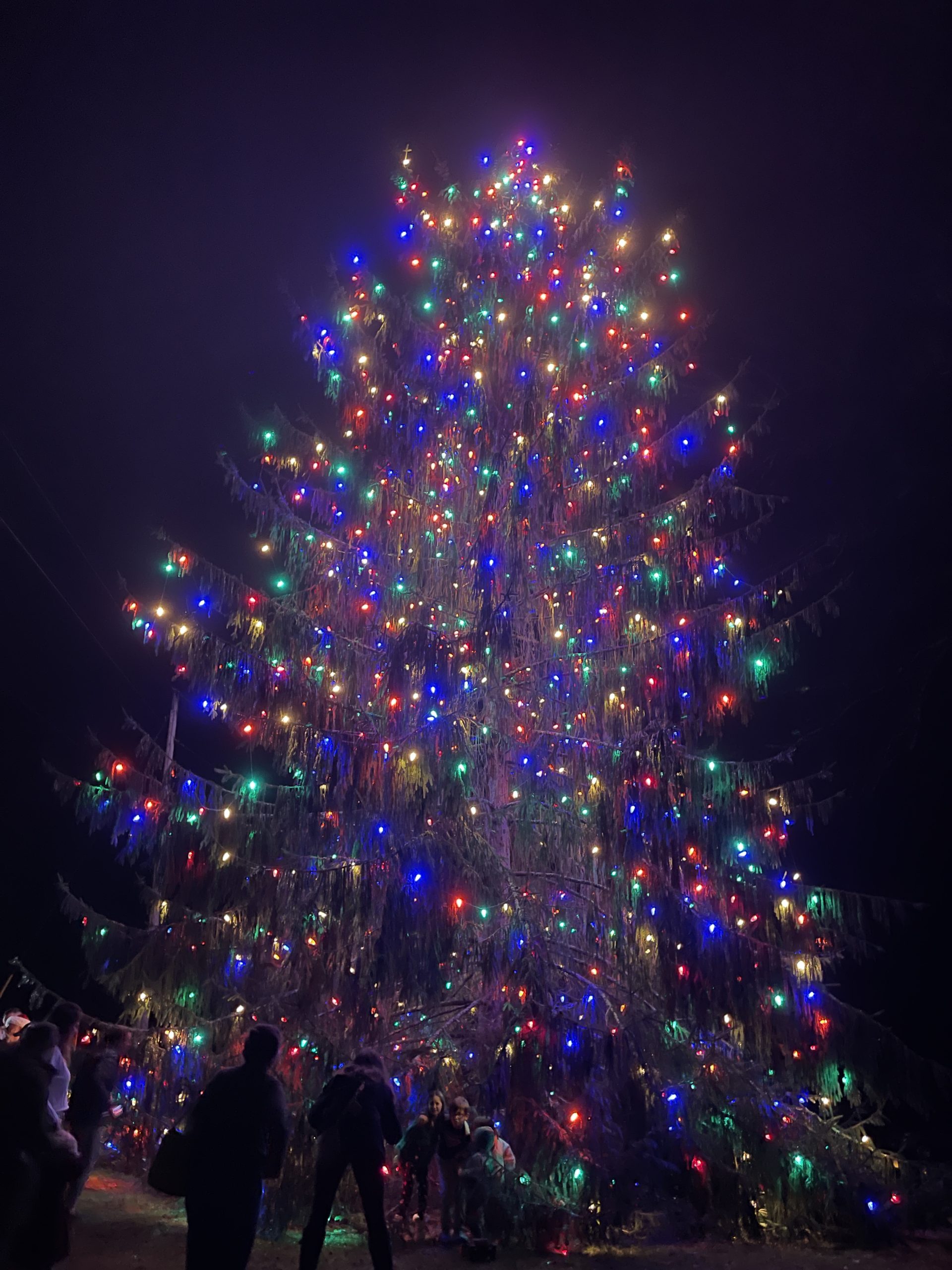 Local choirs gathered at the base of the towering spruce to perform classic Christmas carols, their voices echoing through the crisp mountain air as families and friends celebrated together.