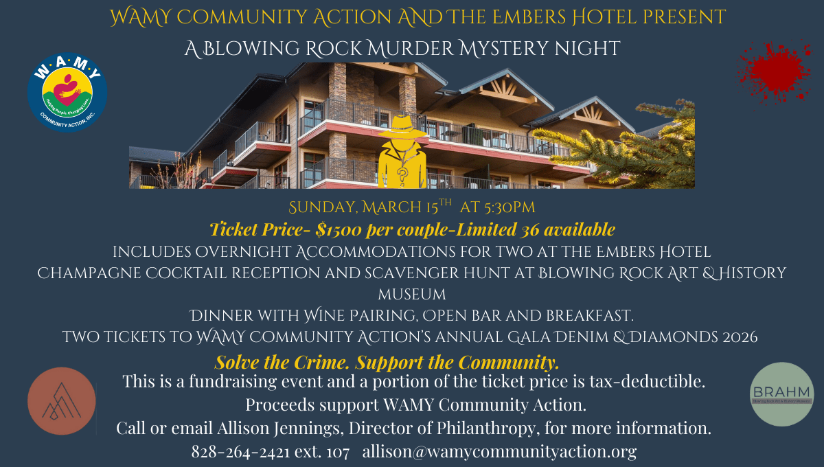 BLOWING ROCK — WAMY Community Action, in partnership with The Embers Hotel and the Blowing Rock Art & History Museum (BRAHM), is proud to announce a one-of-a-kind fundraising event, “Double WAMY-A Blowing Rock Murder Mystery Night.” This unique evening of suspense and community support will take place on Sunday, March 15, beginning at 5:30 PM. This special event offers an immersive experience featuring some of our community's finest stars. Guests will be tasked to solve a thrilling crime while supporting the vital work of WAMY Community Action. The evening is a fundraiser, and a portion of each ticket purchase is tax-deductible, with proceeds directly benefiting WAMY's mission of helping people and changing lives in the High Country.
