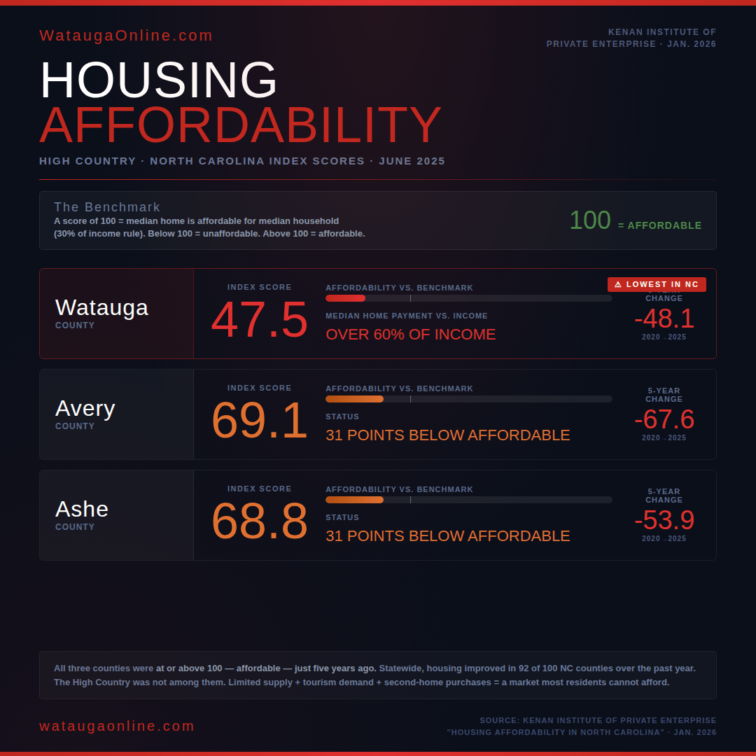Ashe and Avery counties, the other core counties in WataugaOnline's coverage area, fare only slightly better. Ashe County's latest index is 68.8, and Avery County's is 69.1 — both well below the affordability threshold and among the least affordable counties in the state.