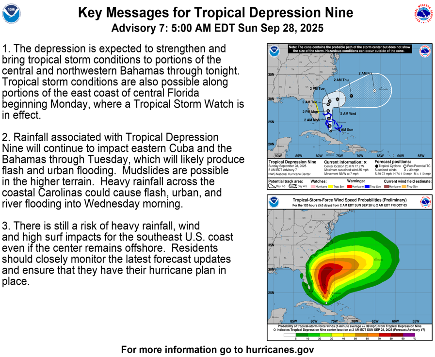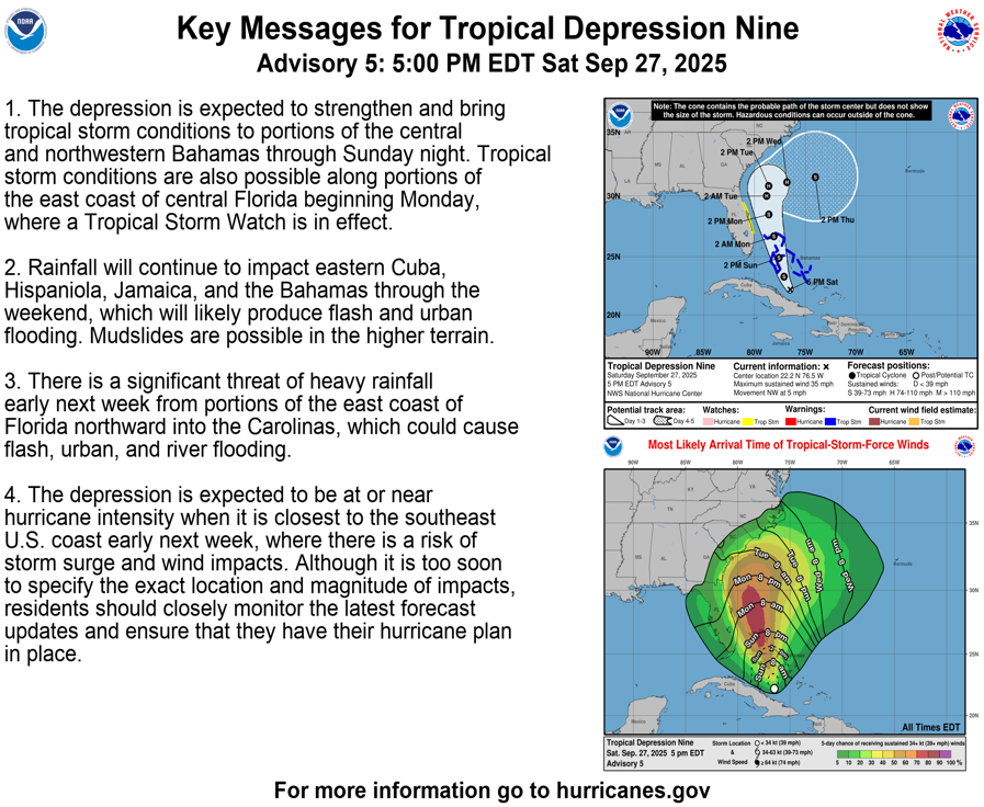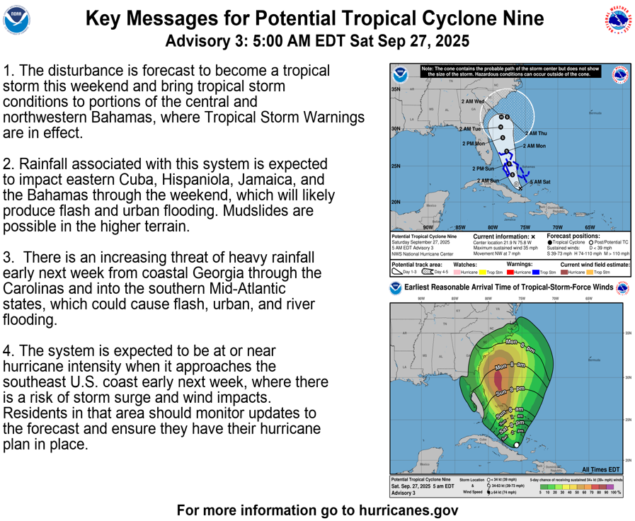 Friday, Sept 26, 2025, 5pm – This is the first forecast track for Potential Tropical Cyclone Nine from the National Hurricane Center. Stay weather aware over the next several days as the track could always change.