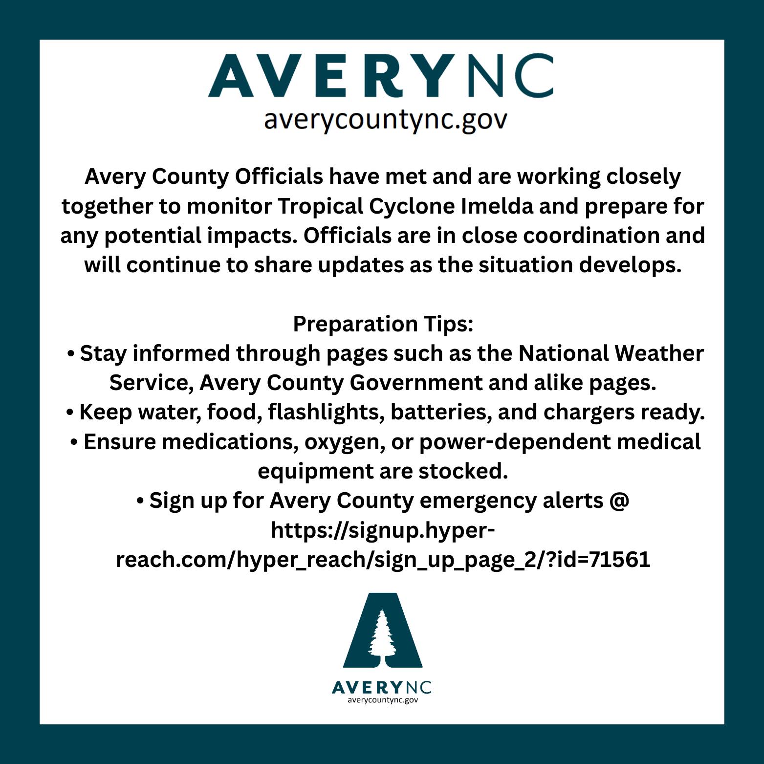 Statement from Avery Government on preps for storm 94L/Imelda – Friday Sept 26, 2025.