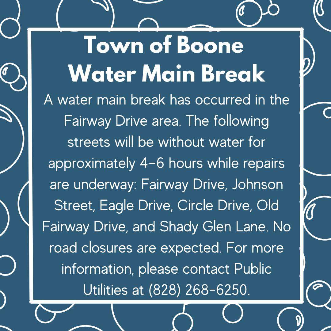 The following streets will be without water for approximately 4–6 hours while repairs are underway: Fairway Drive, Johnson Street, Eagle Drive, Circle Drive, Old Fairway Drive, and Shady Glen Lane.