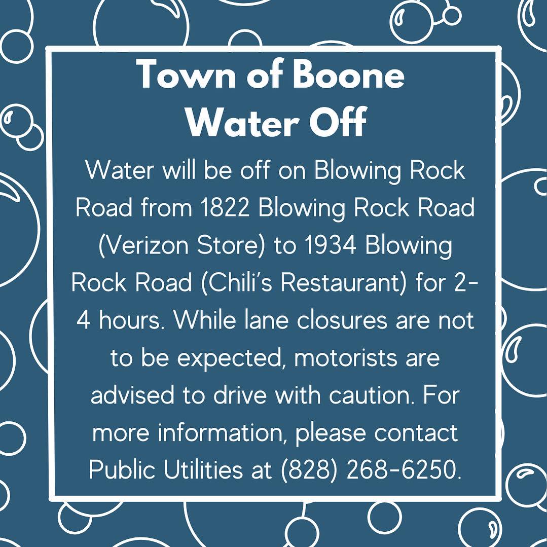 Tuesday, Sept 16, 4 pm – Water will be off on Blowing Rock Road from 1822 Blowing Rock Road (Verizon Store) to 1934 Blowing Rock Road (Chili’s Restaurant) for 2-4 hours.
