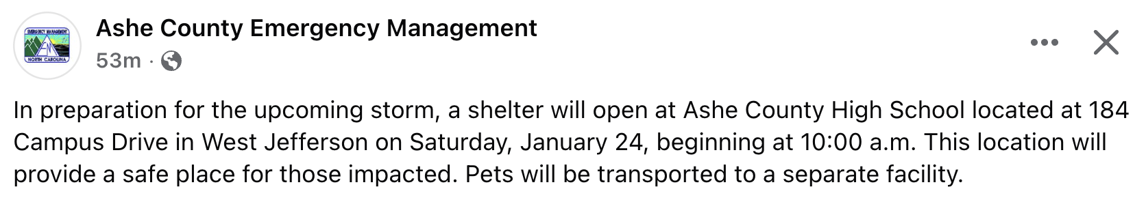 According to Ashe County Emergency Management – “In preparation for the upcoming storm, a shelter will open at Ashe County High School located at 184 Campus Drive in West Jefferson on Saturday, January 24, beginning at 10:00 a.m. This location will provide a safe place for those impacted. Pets will be transported to a separate facility.”