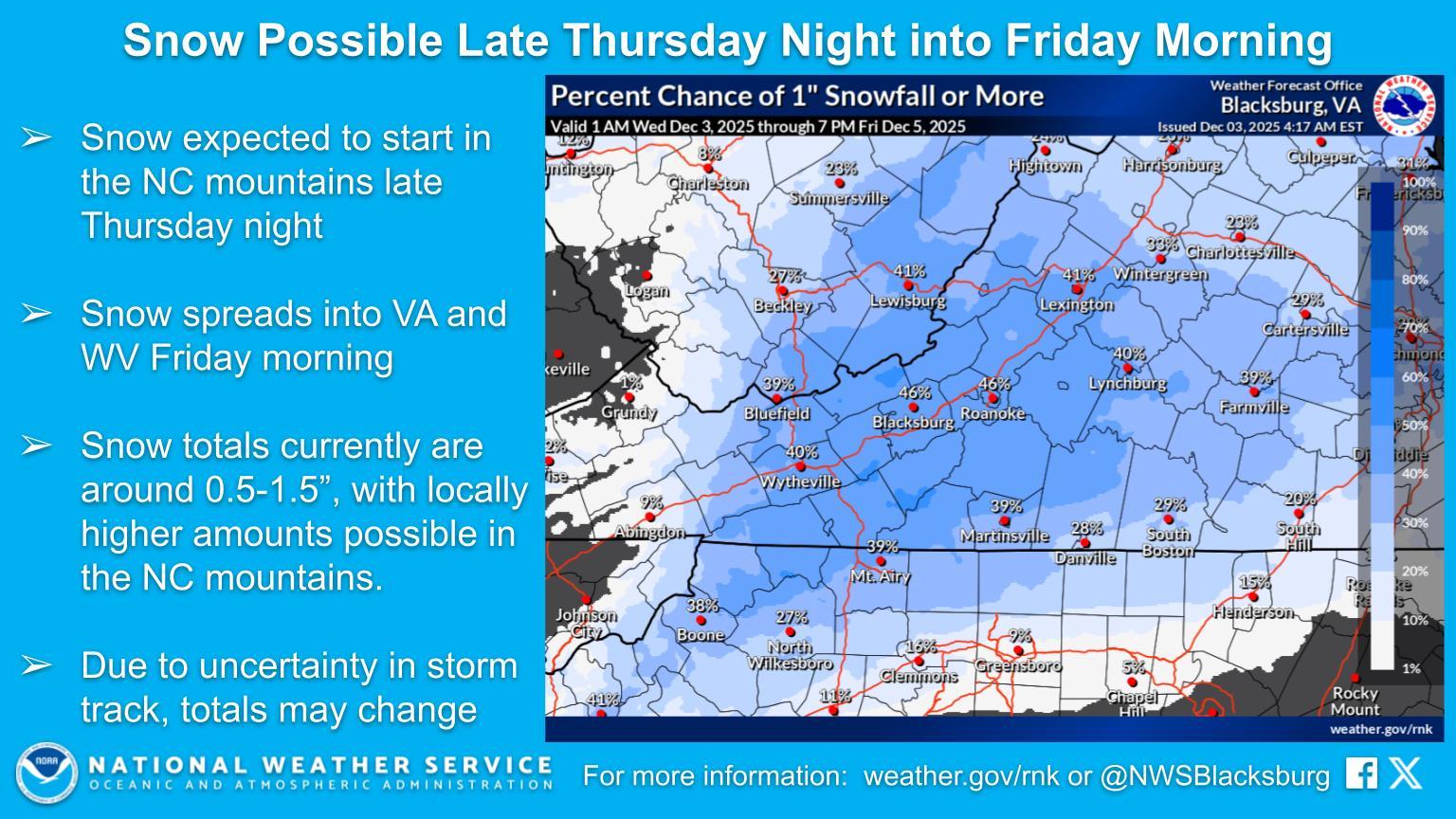 - WHAT…Wet snow expected. Total snow accumulations between 2 and 4